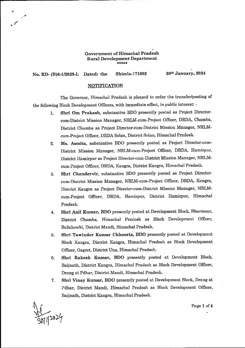 हिमाचल प्रदेश में 30 खंड विकास अधिकारियों के तबादले, यहां देखें पूरी सूची