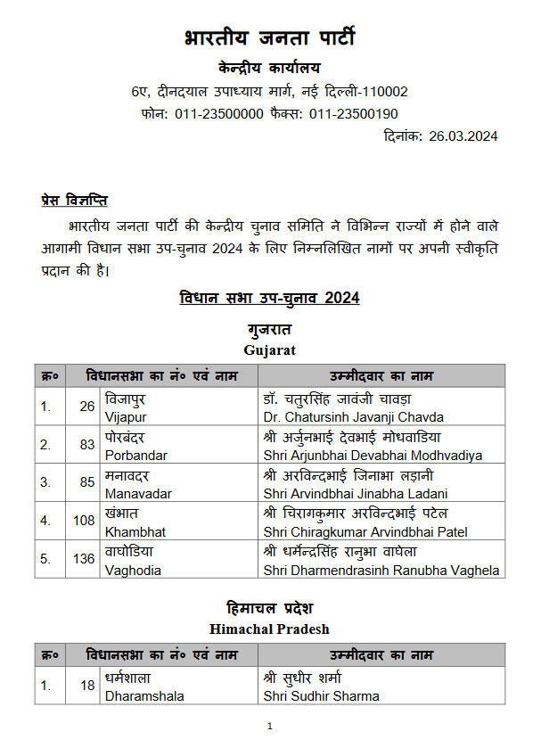 BJP ने विधानसभा उम्मीदवार घोषित किए; हिमाचल की 6 सीटों पर उपचुनाव के लिए ये नाम आए सामने, फटाफट यहां देखिए