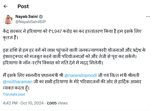 दरअसल, सीएम सैनी ने सोशल मीडिया पर एक्स पर लिखा- केंद्र सरकार ने हरियाणा को 1,947 करोड़ का कर हस्तांतरण किया है हम इसके लिए कृतज्ञ हैं। इस राशि से हम हर वर्ग को लाभ पहुंचाने वाली जनकल्याणकारी योजनाओं और प्रदेश के इंफ्रास्ट्रक्चर को मजबूत करने वाली परियोजनाओं को और तेजी से पूरा कर सकेंगे। हरियाणा के नॉन-स्टॉप विकास को गति देने में मदद मिलेगी।