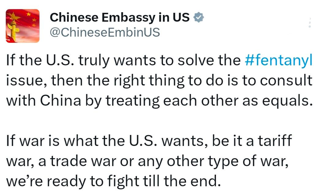वहीं चीन ने कहा, चीन पर अधिकतम दबाव डालने वाला कोई भी व्यक्ति गलत व्यक्ति को चुन रहा है और गलत अनुमान लगा रहा है। अगर अमेरिका सच में फेंटेनाइल मुद्दे को सुलझाना चाहता है, तो सही बात यह है कि वह चीन के साथ परामर्श करे और एक दूसरे को बराबरी का दर्जा दे। यानि चीन ने साफ कर दिया है कि चाहें टैरिफ युद्ध हो, व्यापार युद्ध या किसी और तरह का युद्ध। अमेरिका से हर युद्ध के लिए चीन दो-दो हाथ करने के लिए तैयार है। अब देखना होगा कि चीन के इस बयान पर अमेरिका की क्या प्रतिक्रिया होती है।