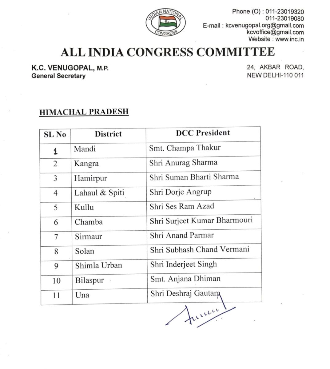हिमाचल और जम्मू कश्मीर के लिए कांग्रेस ने जिला अध्यक्षों की नियुक्ति की, देखें
