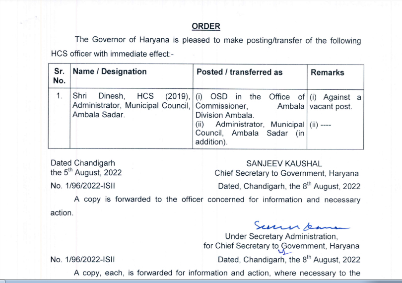 DC Transfers in Haryana : हरियाणा में झज्जर जिले के डीसी शक्ति सिंह को रोहतक जिले का अतिरिक्त कार्यभार सौंपा गया है| वहीं, अंबाला में एक HCS अधिकारी को लेकर भी फेरबदल किया गया है| देखें आदेश...