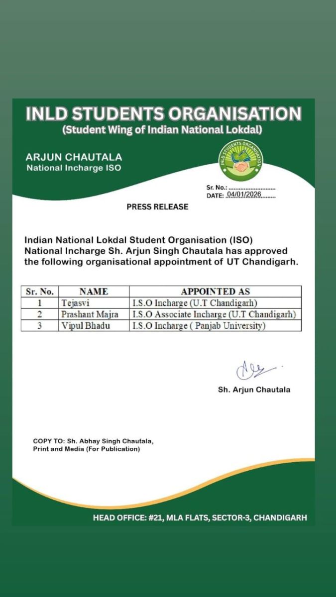 संगठन का विस्तार करते हुए इनेलो की छात्र इकाई आईएसओ के राष्ट्रीय प्रभारी अर्जुन चौटाला ने राष्ट्रीय अध्यक्ष चौ. अभय सिंह चौटाला और प्रदेश अध्यक्ष रामपाल माजरा से विचार विमर्श करके विभिन्न पदों पर चंडीगढ़ यूटी के लिए 3 महत्वपूर्ण नियुक्तियां की हैं।