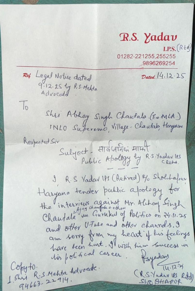 39 छित्तर वाले बयान पर मांगी मांफी, पूर्व आईपीएस राम सिंह यादव ने लिखा अभय चौटाला को पत्र
