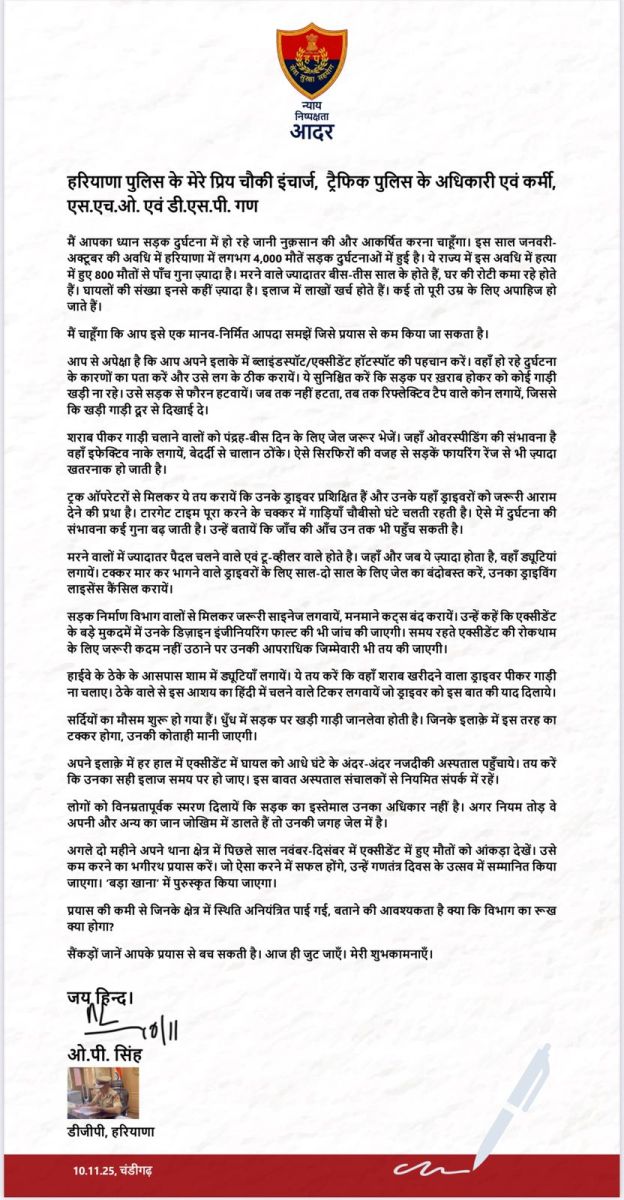 Haryana DGP OP Singh issues traffic advisory: हरियाणा के डीजीपी ओ पी सिंह ने ट्रैफिक एडवाइजरी जारी की: जारी किया आदेश