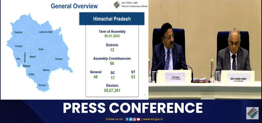 मुख्य चुनाव आयुक्त राजीव कुमार (Chief Election Commissioner of India) ने जानकारी दी कि हिमाचल में 12 नवंबर को विधानसभा चुनाव के लिए वोटिंग करवाई जाएगी| जबकि वोटों की गिनती 8 दिसंबर को होगी|