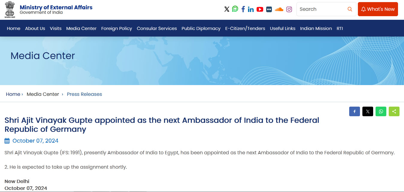 विदेश मंत्रालय के अनुसार, इजरायल के साथ-साथ इजिप्ट (मिस्र) में भी भारत के राजदूत का तबादला किया गया है। 1991 बैच के IFS अफसर अजीत विनायक को इजिप्ट से हटाकर जर्मनी में भारत के अगले राजदूत के रूप में नियुक्त किया गया है।
