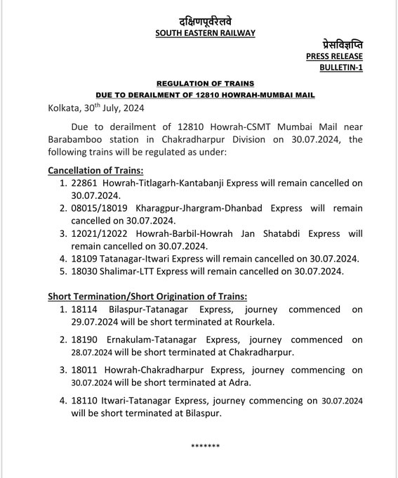 जबकि तीन ट्रेनें, 18114 बिलासपुर से टाटा एक्सप्रेस को राउरकेला में शॉर्ट-टर्मिनेट किया गया है, 18190 एर्नाकुलम से टाटा एक्सप्रेस को चक्रधरपुर में शॉर्ट-टर्मिनेट किया गया है और 18011 हावड़ा चक्रधरपुर एक्सप्रेस को आद्रा में शॉर्ट-टर्मिनेट किया गया है। सीपीआरओ ने बताया कि, 80% से अधिक यात्रियों को बसों और अन्य प्रमुख माध्यमों से नजदीकी स्टेशनों पर स्थानांतरित कर दिया गया है और उन्हें एक विशेष रेक के साथ आगे की यात्रा करने का विकल्प प्रदान किया जा रहा है।
