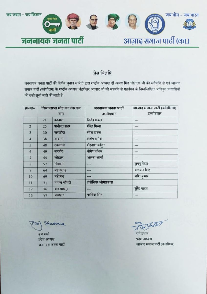 JJP-ASP ने जारी की उम्मीदवारों की छठी लिस्ट, देखें किसे और कहां से दिया टिकट