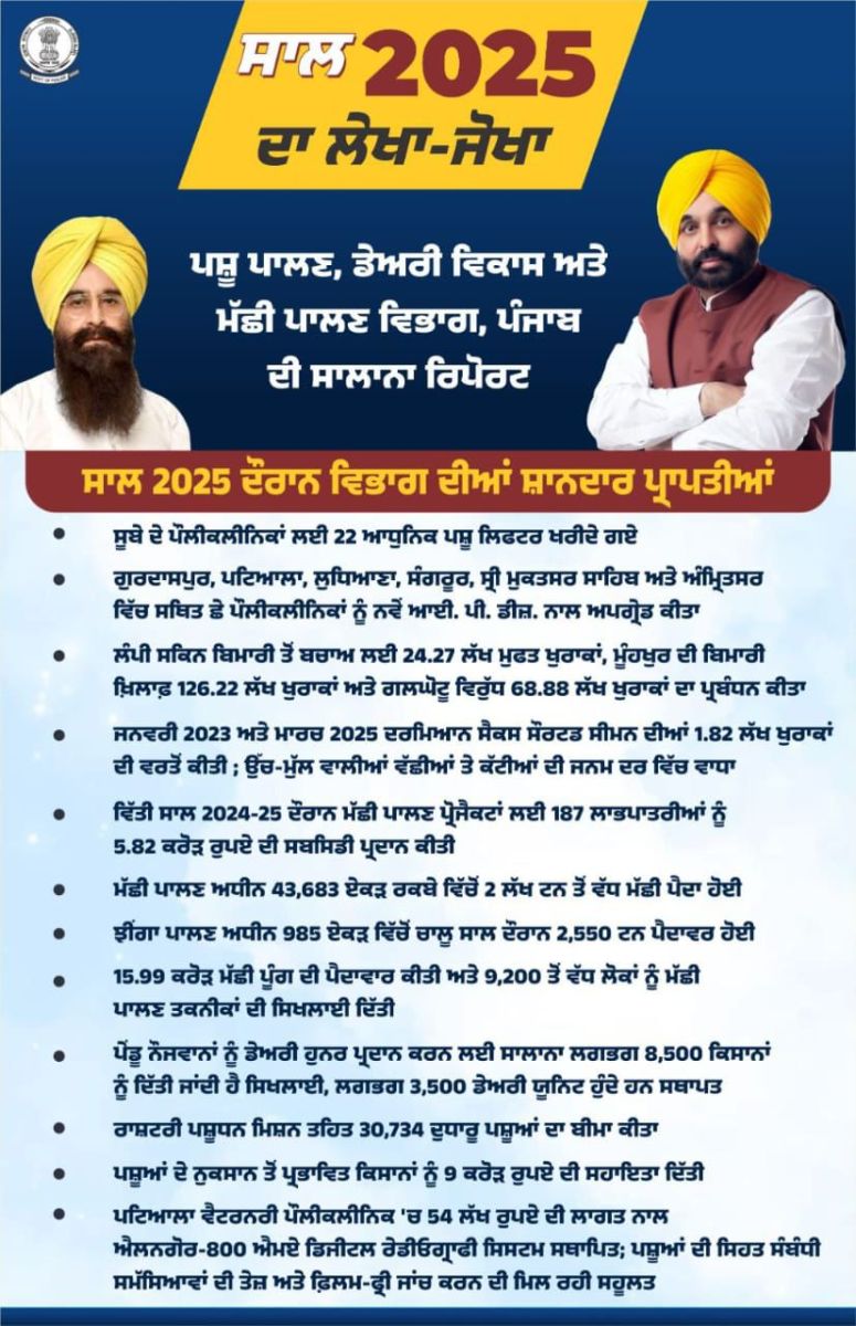 पशुपालन, डेयरी विकास एवं मत्स्य पालन विभाग के प्रमुख सचिव श्री राहुल भंडारी ने कहा, ‘‘यह वर्ष हमारी दोहरी प्रतिबद्धता का प्रमाण रहा है: संकट में मिसाली सेवा एवं भविष्य के लिए दूरदर्शी योजना। जीवन बचाने वाले उपकरणों से लेकर अति-आधुनिक प्रजनन तकनीक तक, हर कदम का उद्देश्य पंजाब को खुशहाल एवं वैज्ञानिक रूप से उन्नत पशुपालन क्षेत्र बनाना है।’’