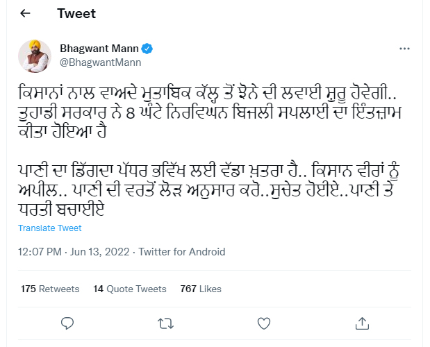 Punjab News : मुख्यमंत्री भगवंत मान ने पंजाब में धान की बुवाई को लेकर एक बार फिर अपना खास बयान जारी किया है| मुख्यमंत्री मान ने ट्वीट करते हुए कहा कि 14 जून से सूबे में धान की बुवाई शुरू हो जाएगी| ऐसे में सरकार उनके लिए 8 घंटे लगातार बिना किसी कट के निर्बाध बिजली आपूर्ति की व्यवस्था कर रही है| वहीं, इसके साथ ही सीएम मान ने धान की बुवाई पर किसानों से एक बड़ी अपील भी की|