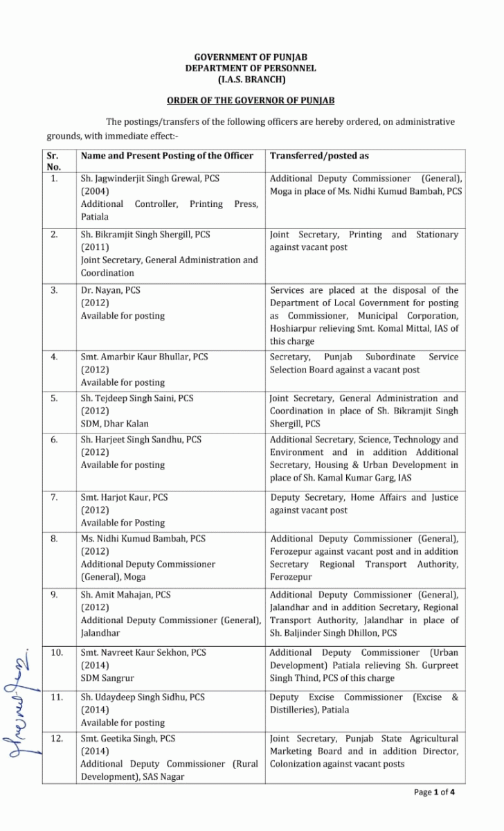 पंजाब में बड़े पैमाने पर प्रशासनिक फेरबदल; कई जिलों में ADC-SDM बदले, 50 PCS अफसरों को सौंपी गई है नई जिम्मेदारी, लिस्ट देखें