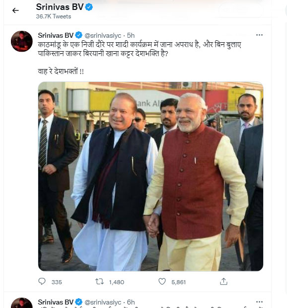 वहीं, श्रीनिवास बीवी (Srinivas BV) ने पीएम मोदी की पाकिस्तान के पूर्व प्रधानमंत्री नवाज शरीफ (PM Modi And Nawaz Sharif Old Photo) के साथ की फोटो भी शेयर की। श्रीनिवास ने फोटो शेयर करते हुए लिखा कि काठमांडू के एक निजी दौरे पर शादी कार्यक्रम में जाना अपराध है, और बिन बुलाए पाकिस्तान जाकर बिरयानी खाना कट्टर देशभक्ति है?