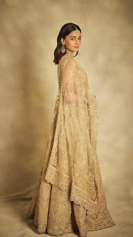 आलिया ने यहां डिजाइनर सब्यसाची का बंधनी लहंगा पहना है जिसमें आलिया काफी गॉर्जियस दिख रही हैं. नीले रंग के इस लहंगे में गोल्डन बॉर्डर ओवरऑल लुक को रॉयल बना रहा है.