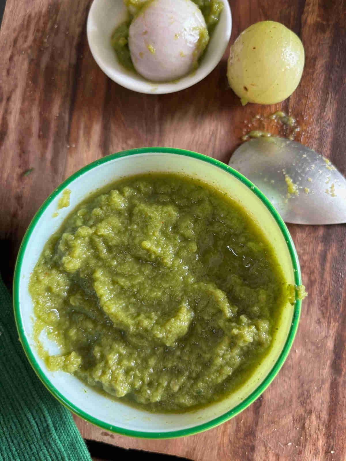 तैयार आंवले की चटनी को एक बर्तन में डालें और ठंडा करके परोसें।