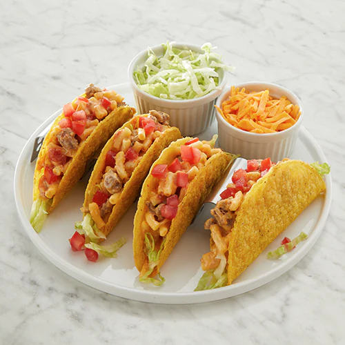 हर टैको शेल में 2-3 टेबलस्पून तैयार मैक एंड चीज़ भरें।