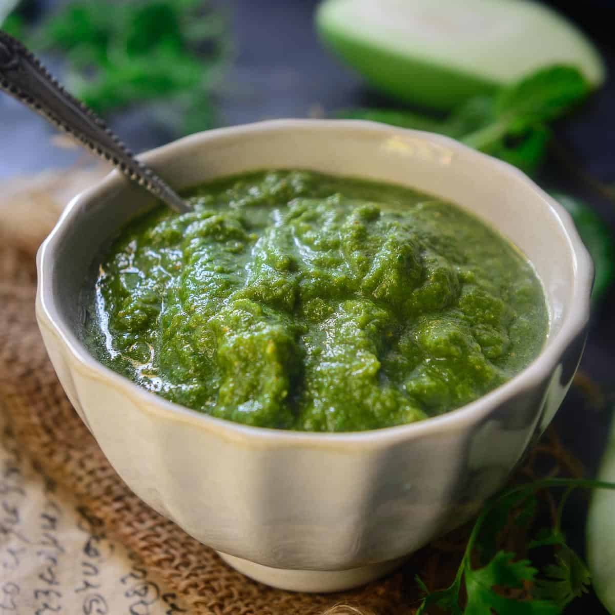 मिश्रण को ठंडा होने दें। ठंडा होने पर इसे मिक्सी में डालें, साथ में धनिया पत्ती और नींबू/इमली डालें।