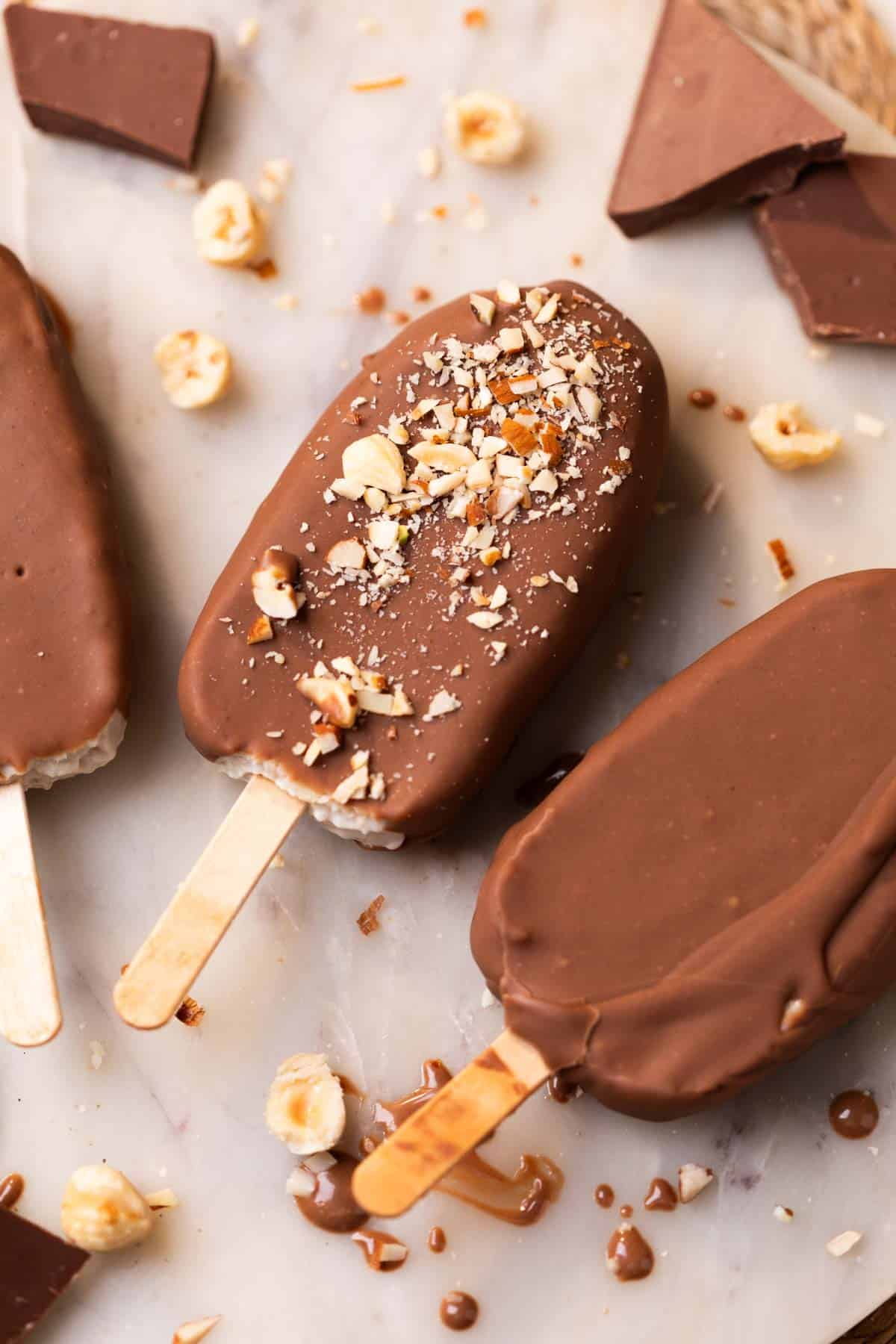 जम चुकी आइसक्रीम को पिघली हुई चॉकलेट में डिप करें।चॉकलेट कोटिंग कुछ ही सेकंड में जम जाएगी।