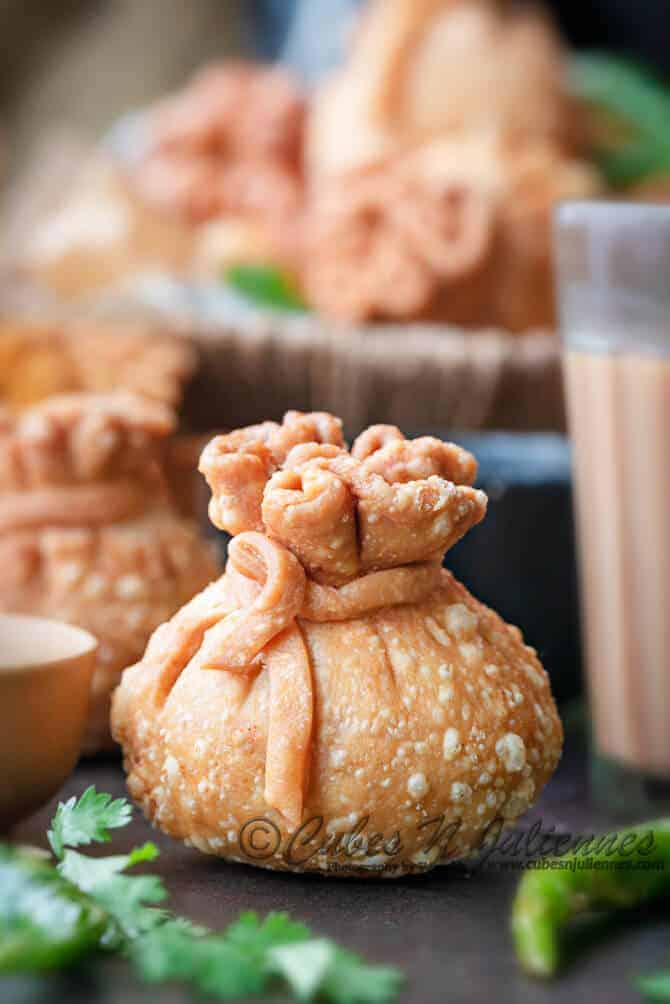 अब आटे से छोटी-छोटी पोटली बनाकर उसमें फीलिंग डालें और पोटली को बंद कर के तेल में डीप फ्राई करें