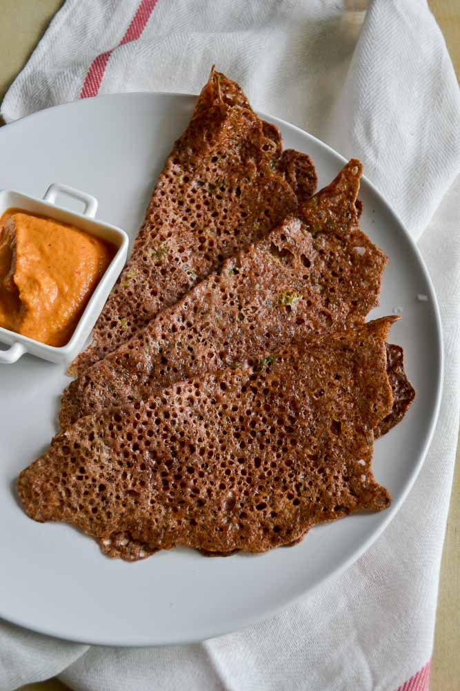 रागी डोसा तैयार है। इसे चटनी (नारियल चटनी, धनिया चटनी) और सांभर के साथ गरमागरम परोसें।