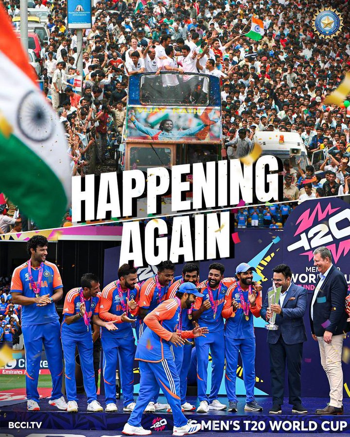 इस हार के ठीक 7 महीने बाद रोहित की ही कप्तानी में टीम इंडिया टी20 वर्ल्ड चैंपियन बन सकी। रोहित शर्मा ने मुंबई में होने वाले रोड शो से पहले भारतीय फैंस से एक खास अपील की है। रोहित शर्मा ने अपने सोशल मीडिया पर पोस्ट करते हुए लिखा कि भारत हम आप सभी के साथ इस खास पल का आनंद लेना चाहते हैं।