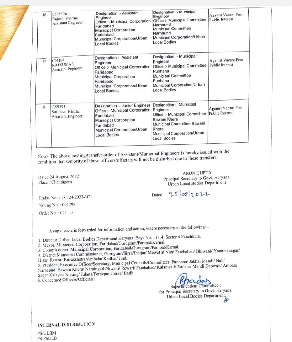 चंडीगढ़। Transfers In municipal corporations: हरियाणा सरकार ने नगर निगमो में बड़ी मात्रा में तबादले कर दिए हे ।सूचि देखें किस का कहां हुआ ट्रांसफर ....