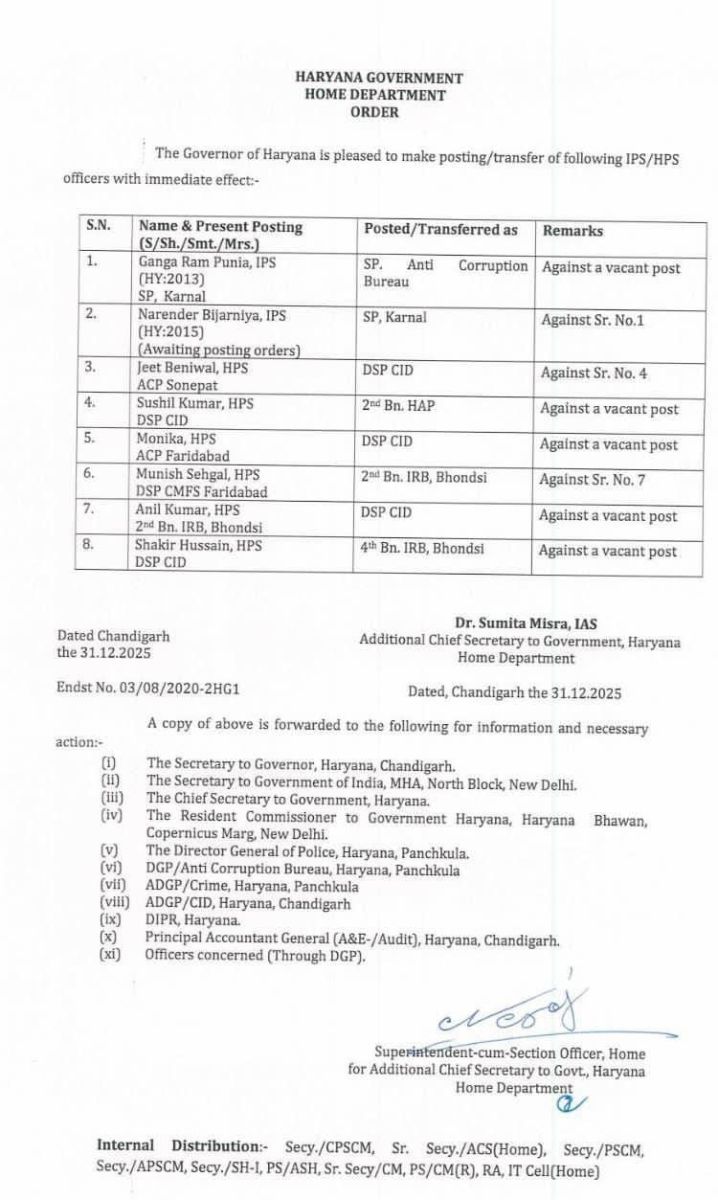 Transfers of IPS and HPS officers in Haryana, transfers done on New Year