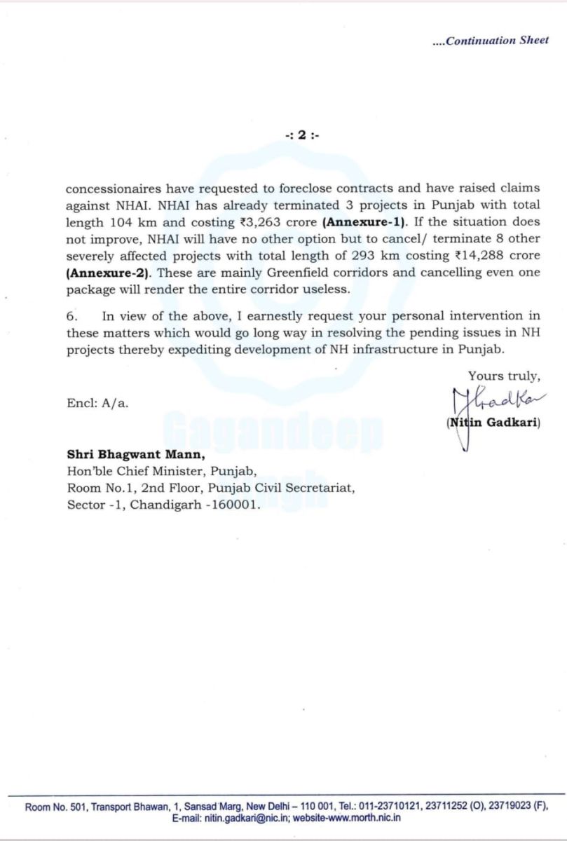 दरअसल, गडकरी ने NHAI के अधिकारियों और ठेकेदारों की सुरक्षा को लेकर पंजाब सरकार पर सवाल उठाए हैं। सीएम मान को इस तरह की चिट्ठी लिखने पर नितिन गडकरी तब मजबूर हुए हैं। जब पंजाब में NHAI के अधिकारियों और ठेकदारों व उनकी टीम के साथ अप्रिय हिंसक घटनाएं सामने आई हैं। इसके साथ ही नितिन गडकरी ने अपनी चिट्ठी में भूमि अधिग्रहण के लंबित मामलों का भी मुद्दा उठाया है।
